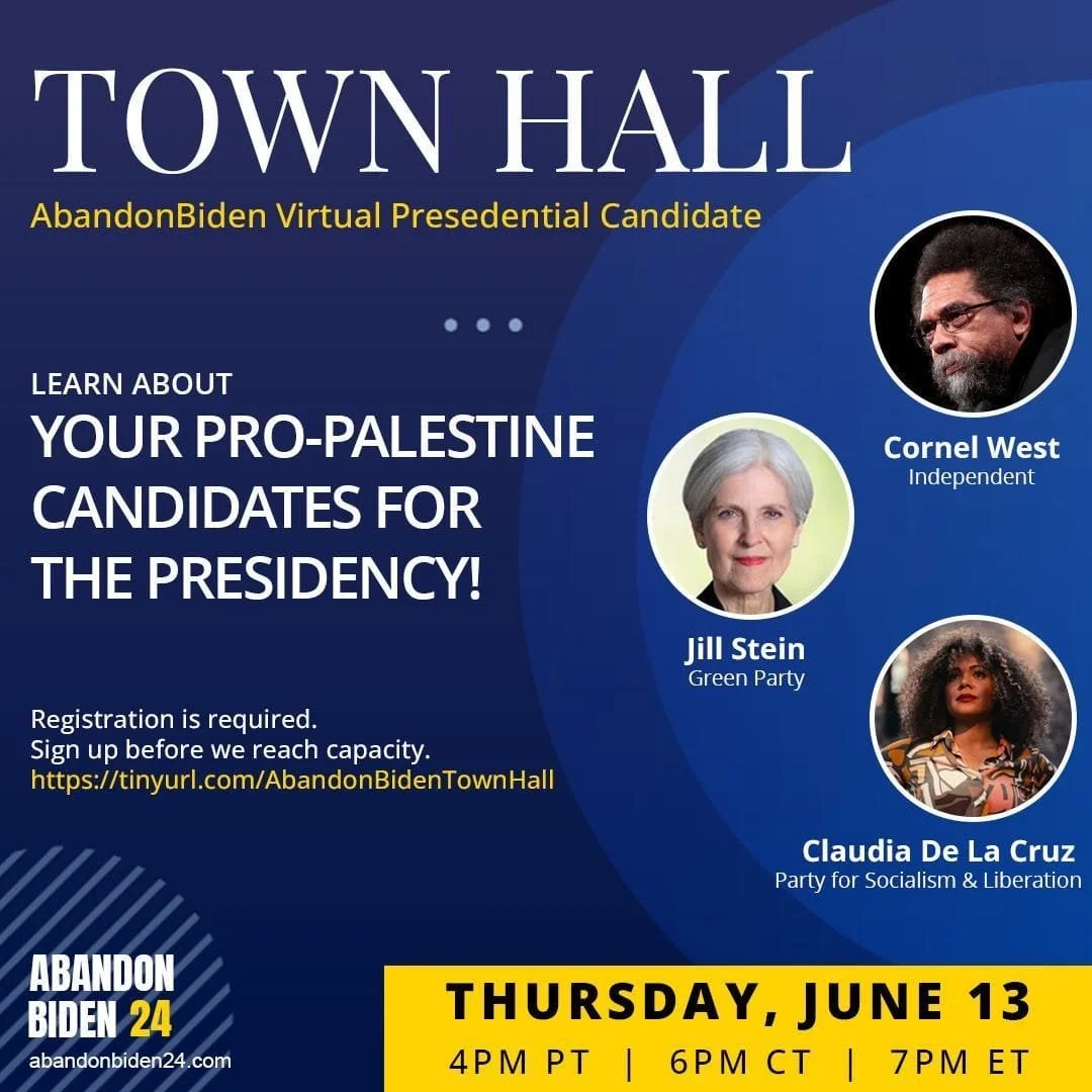 AbandonBiden - Virtual Town Hall 2024 View fullsize Thursday, June 13, 2024 at 4 PMSign Up: Tinyurl.com/AbandonBidenTownHall Asma NooruddinJanuary 29, 2024Comment Facebook0 Twitter LinkedIn0 Reddit Tumblr 0 Likes