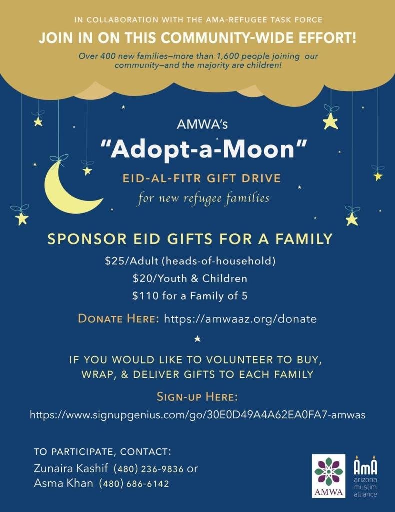 Assalamo Alaikum Everyone, Please join AMWA’s “Adopt-a-Moon” Eid-Al-Fitr Gift Drive to support new refugee families. Details are given in the flyer and you can sign up at the signupgenius link here: