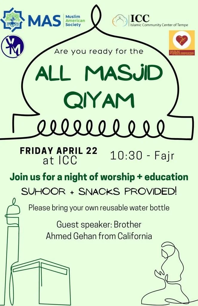 All Masjid Qiyam View fullsize Friday, April 22, 2022 from 10 PM till FajrDirection: 131 E 6th St, Tempe, AZ 85281 Asma NooruddinApril 13, 2022Comment Facebook0 Twitter LinkedIn0 Reddit Tumblr 0 Likes