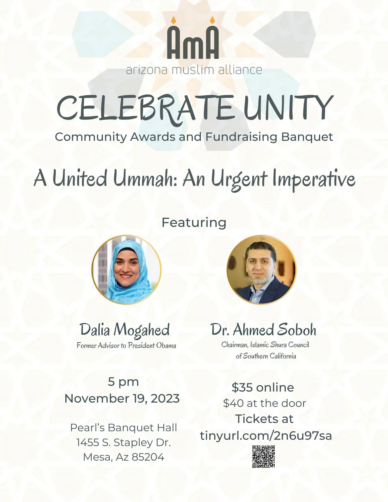 AMA - Celebrate Unity 2023 View fullsize Sunday, November 19, 2023 at 5 PMDirection: Pearl's Banquet Hall 1455 S Stapley Dr, Mesa, AZ 85204 Asma NooruddinNovember 1, 2023Comment Facebook0 Twitter LinkedIn0 Reddit Tumblr 0 Likes