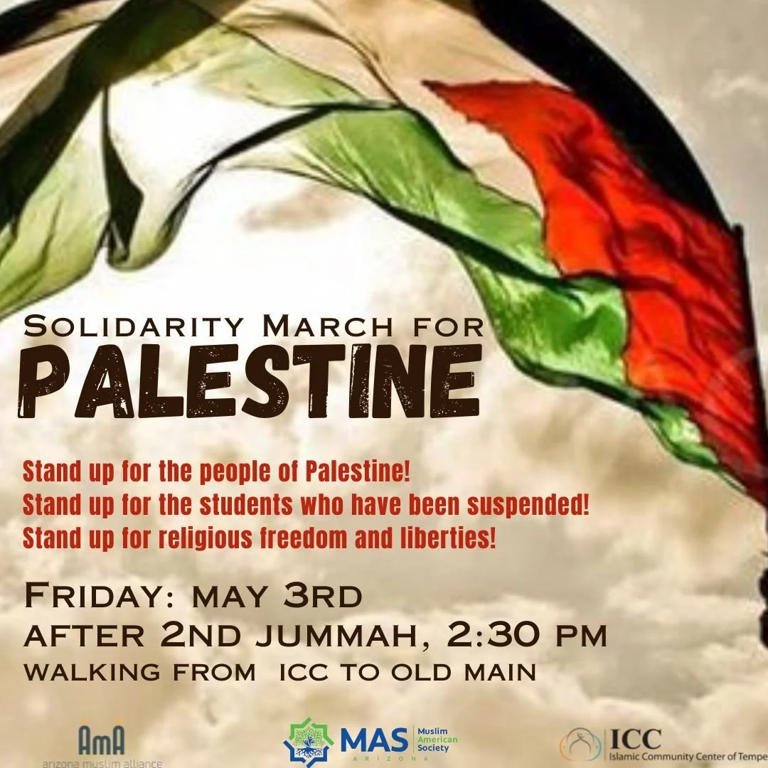AMA-MAS-ICC - Solidarity March for Palestine 2024 View fullsize Friday, May 3, 2024 at 2:30Direction: 131 E 6th St, Tempe, AZ 85281 Asma NooruddinNovember 3, 2023Comment Facebook0 Twitter LinkedIn0 Reddit Tumblr 0 Likes