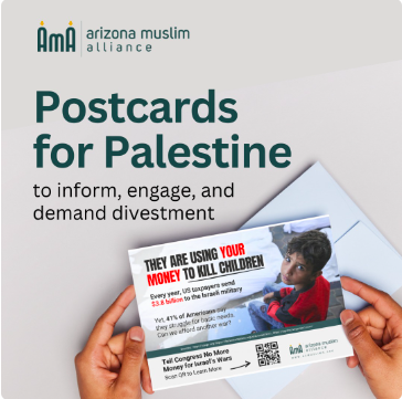 Join the Arizona Muslim Alliance's latest Gaza awareness campaign, Postcards for Palestine, and help us inform thousands of households across Arizona.