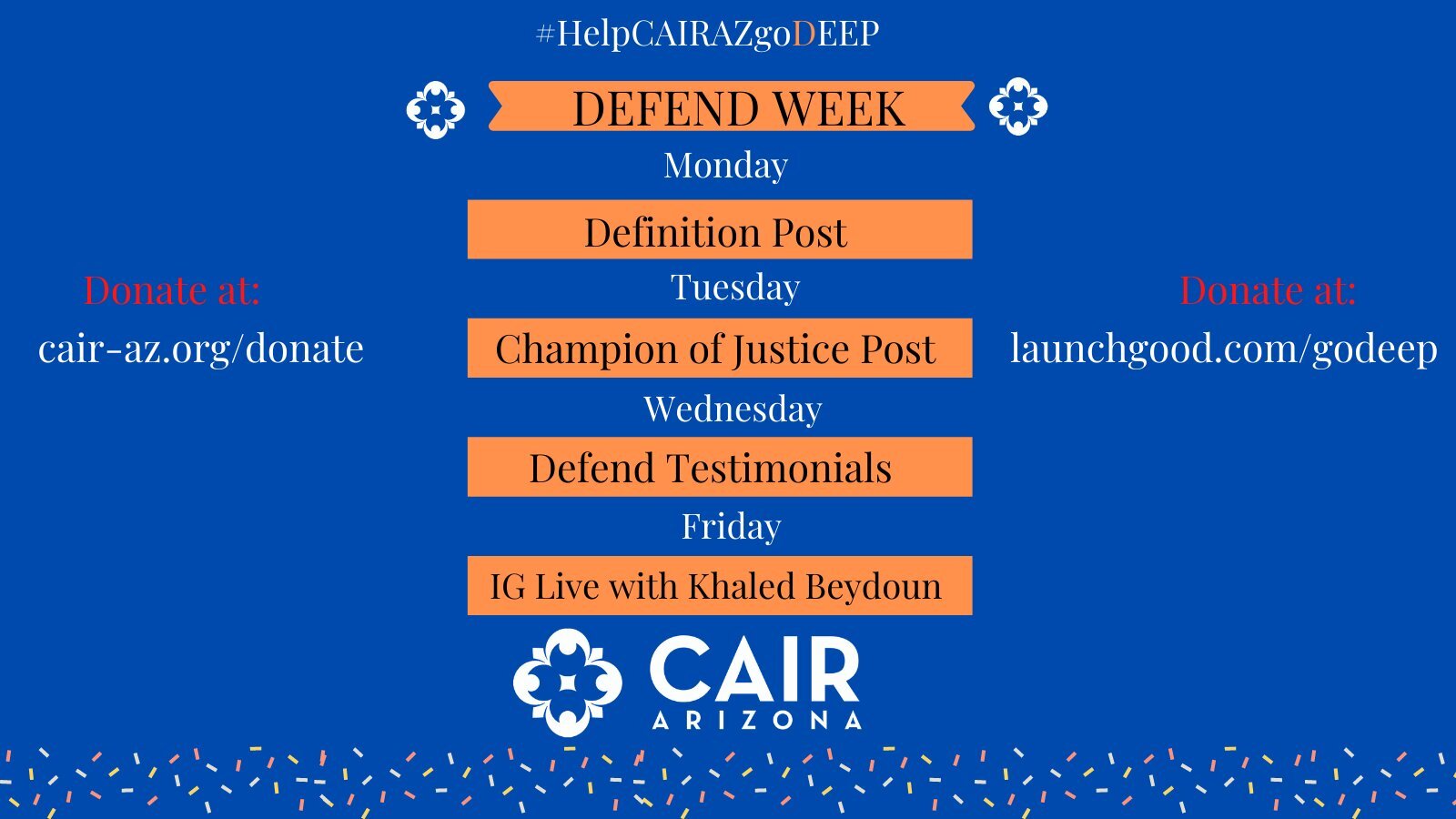 Every week for the next four weeks we will be breaking down the acronym D.E.E.P. The first letter stands for Defend! Below is the schedule for the week. #HelpCAIRAZgoDEEP