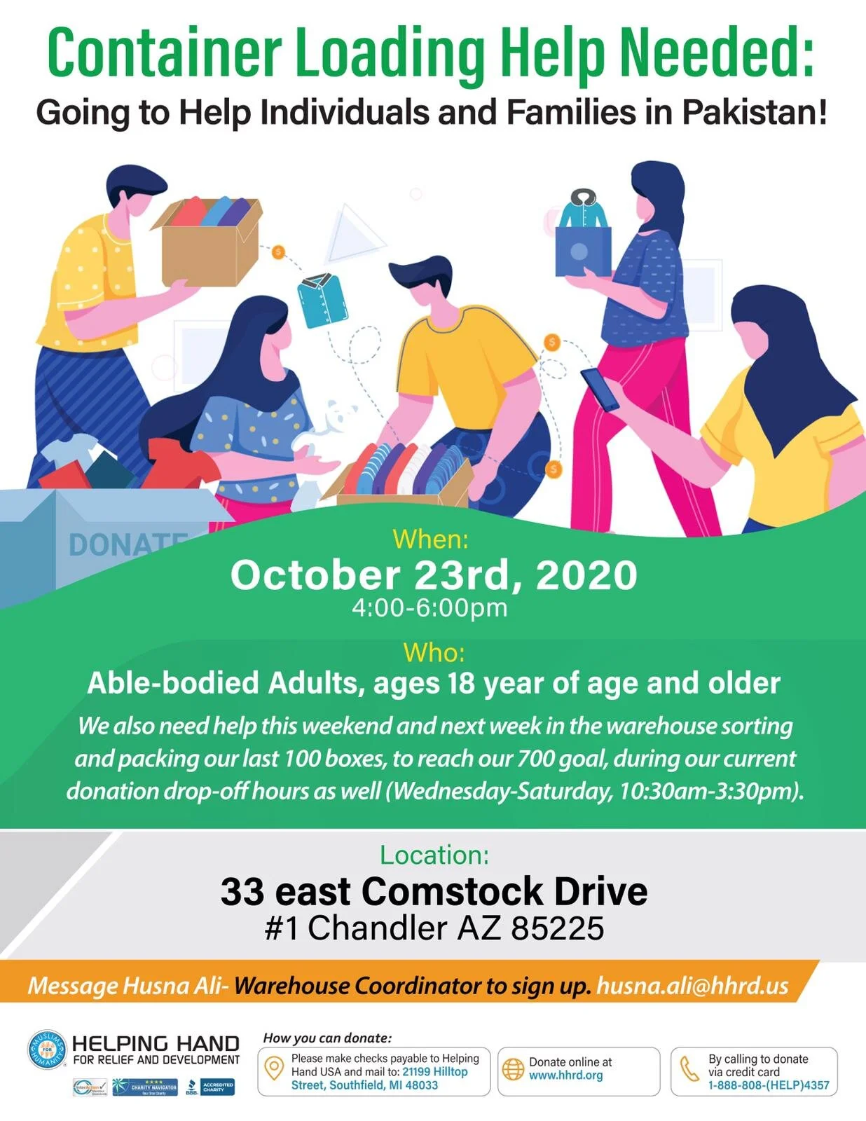 Container Loading Help Needed View fullsize Able-bodied Adults, ages 18 and upFriday, October 23, 2020 from 4 PM to 6 PMLocation: 33 E Comstock Dr Suite #1, Chandler, AZ 85225 Asma NooruddinOctober 22, 2020Comment Facebook0 Twitter LinkedIn0 Reddit Tumblr 0 Likes