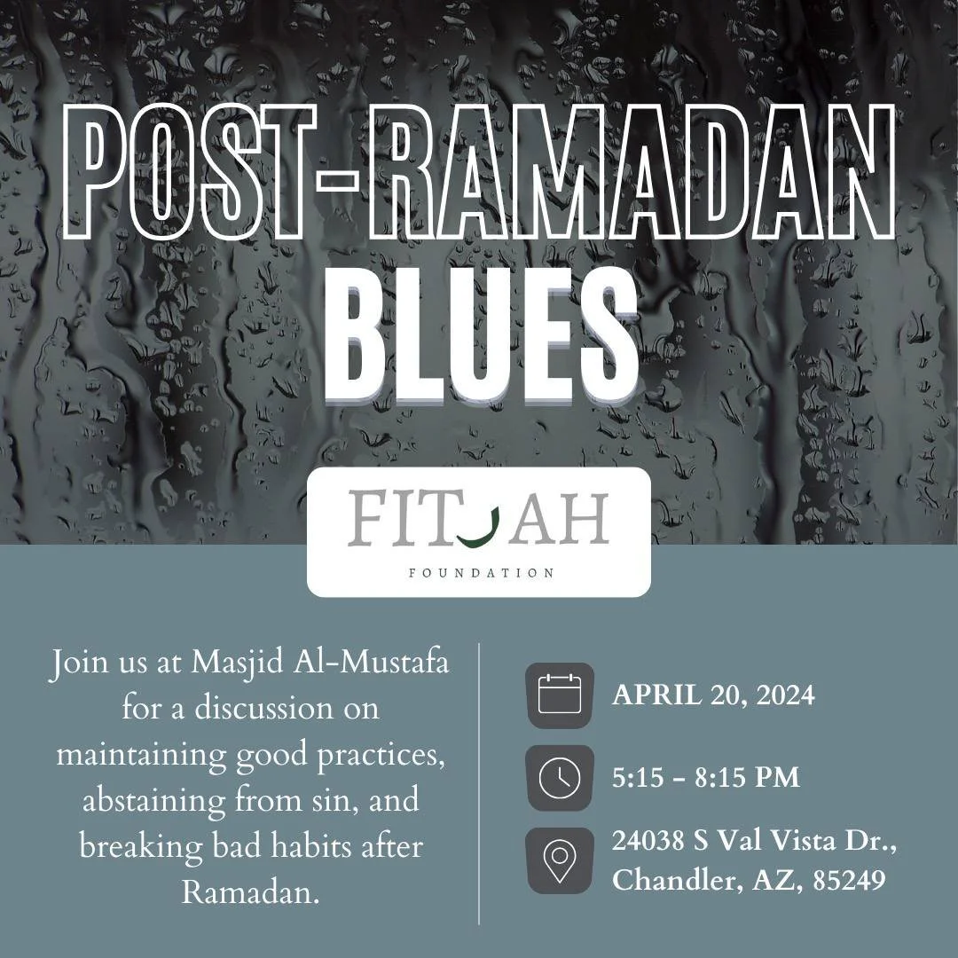 Fitrah - Post Ramadan Blues 2024 View fullsize Saturday, April 20, 2024 from 5:15 PM till 8:15 PMDirection: 1071 N Alma School Rd, Chandler, AZ 85224RSVP: https://forms.gle/iThhj3KXpmRLBUf97 Asma NooruddinOctober 19, 2023Comment Facebook0 Twitter LinkedIn0 Reddit Tumblr 0 Likes