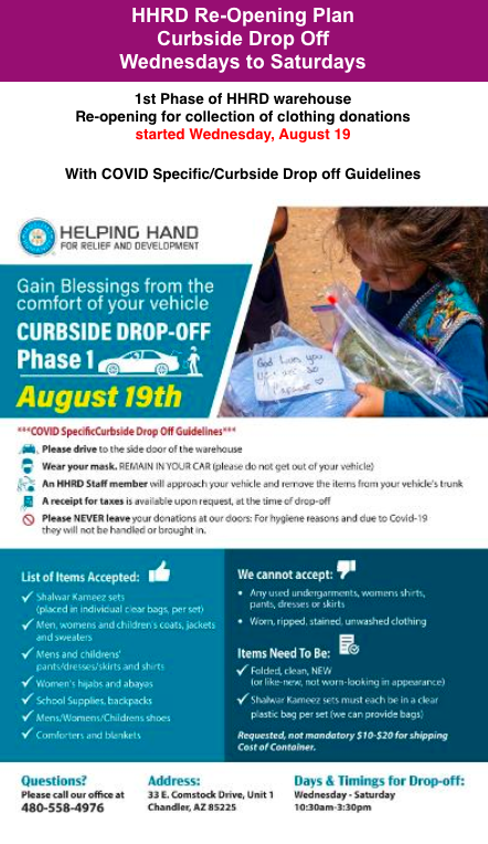 HHRD Curbside Drop Off on Wednesdays Through Saturdays View fullsize Deadline to accept Shalwar Kameez for Pakistan container ends on September.HHRD Curbside Drop Off: Wednesdays, Thursdays & Fridays - 10:30 AM till 3:30 PMSaturdays 10:00 AM till 2:00 PM Asma NooruddinSeptember 18, 2020Comment Facebook0 Twitter LinkedIn0 Reddit Tumblr 0 Likes