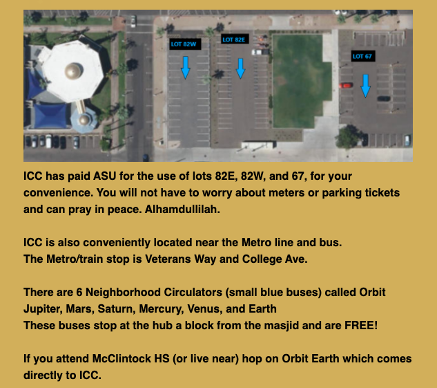 ICC has paid ASU for the use of lots 82E, 82W, and 67, for your convenience. You will not have to worry about meters or parking tickets and can pray in peace. Alhamdullilah.