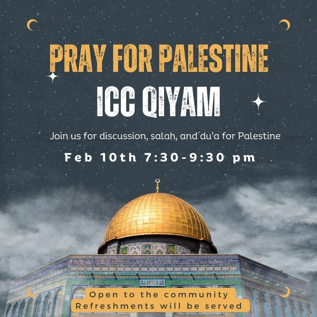 ICC Qiyam - Pray for Palestine 2024 View fullsize Saturday, February 10, 2024 from 7:30 PM till 9:30 PMDirection: 131 E 6th St, Tempe, AZ 85281 Asma NooruddinOctober 31, 2023Comment Facebook0 Twitter LinkedIn0 Reddit Tumblr 0 Likes