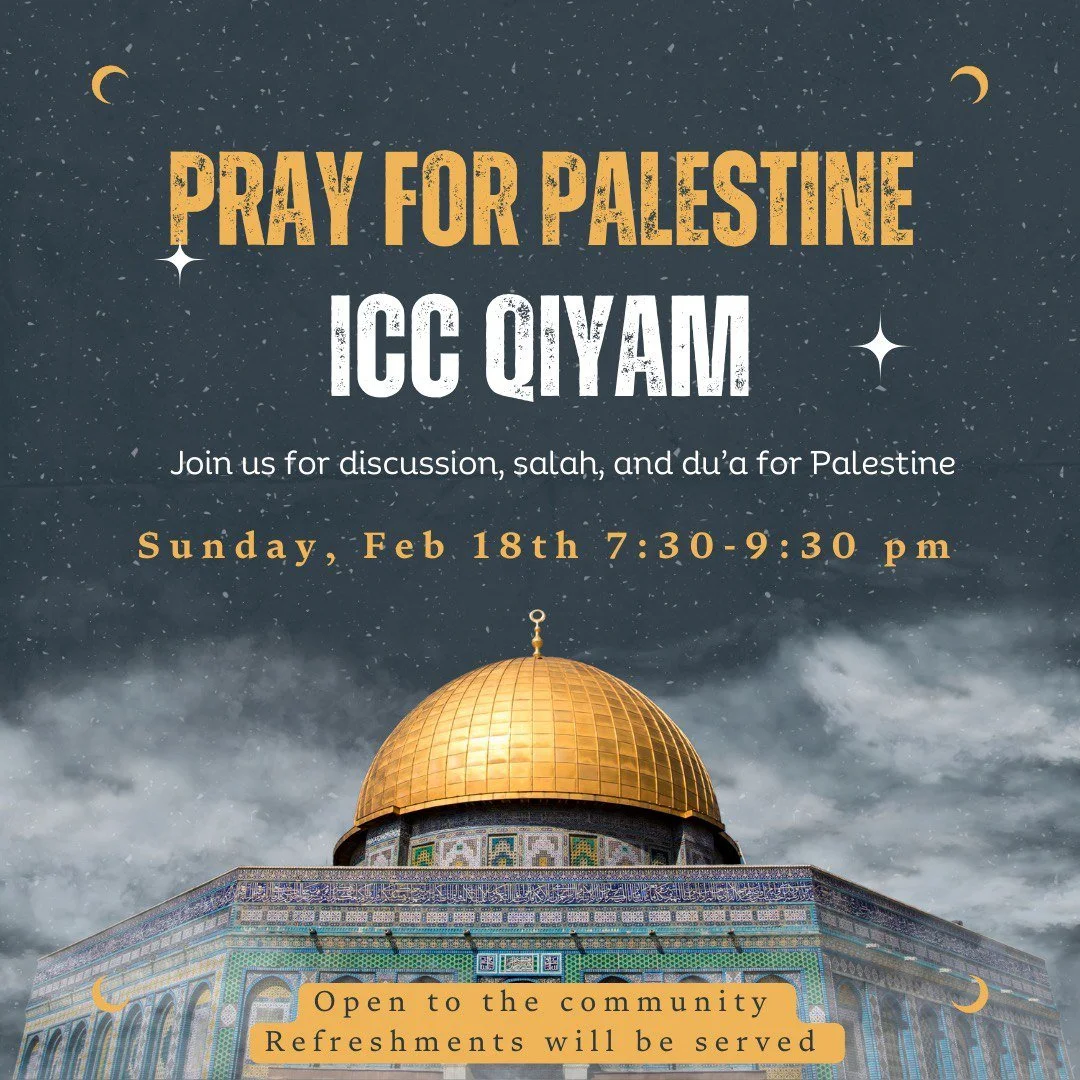 ICC Qiyam - Pray for Palestine 2024 View fullsize Sunday, February 18, 2024 from 7:30 PM till 9:30 PMDirection: 131 E 6th St, Tempe, AZ 85281 Asma NooruddinNovember 1, 2023Comment Facebook0 Twitter LinkedIn0 Reddit Tumblr 0 Likes