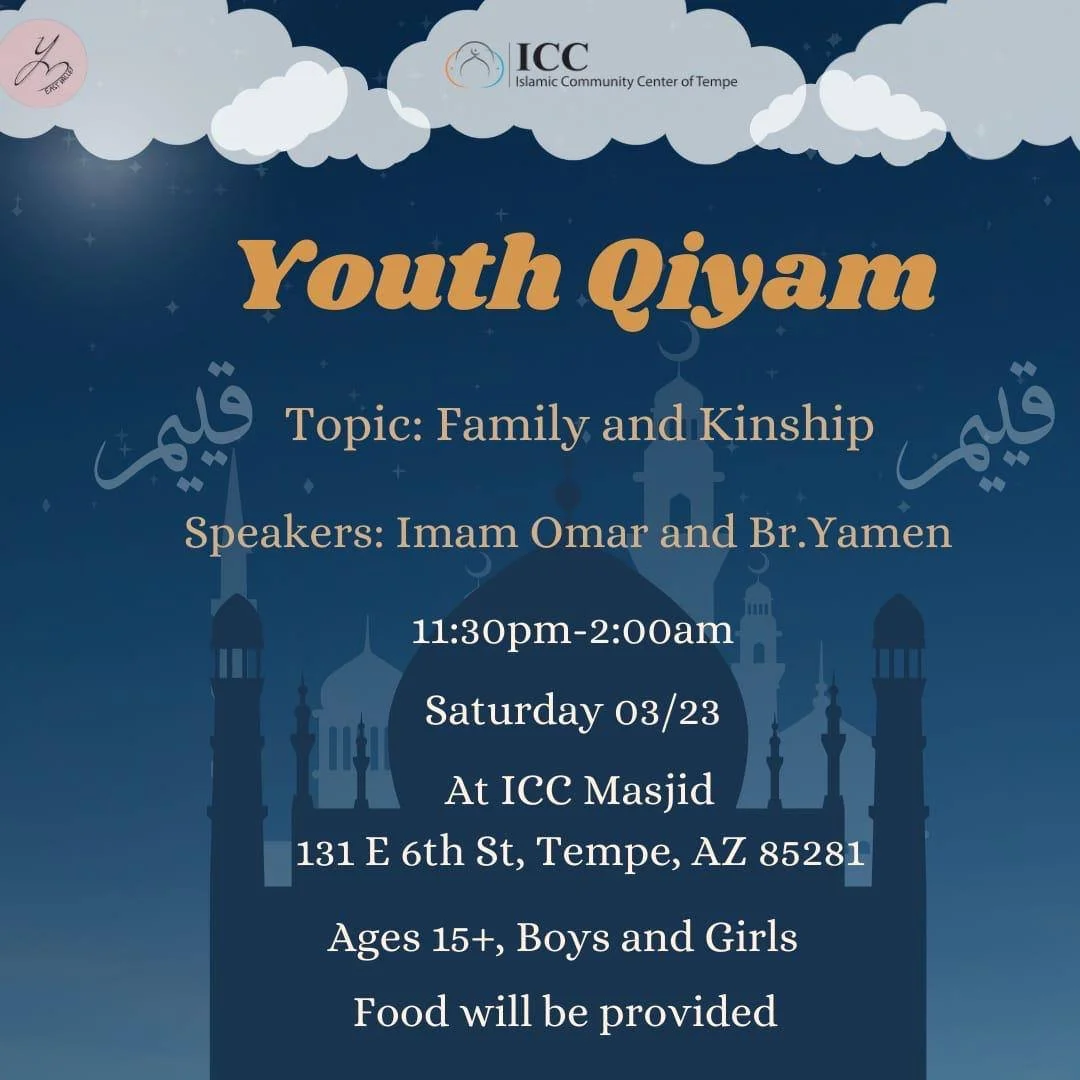 ICC - Youth Qiyam 2024 View fullsize Saturday, March 23, 2024 from 11:30 PM till 2 PMDirection: 131 E 6th St, Tempe, AZ 85281 Asma NooruddinOctober 22, 2023Comment Facebook0 Twitter LinkedIn0 Reddit Tumblr 0 Likes