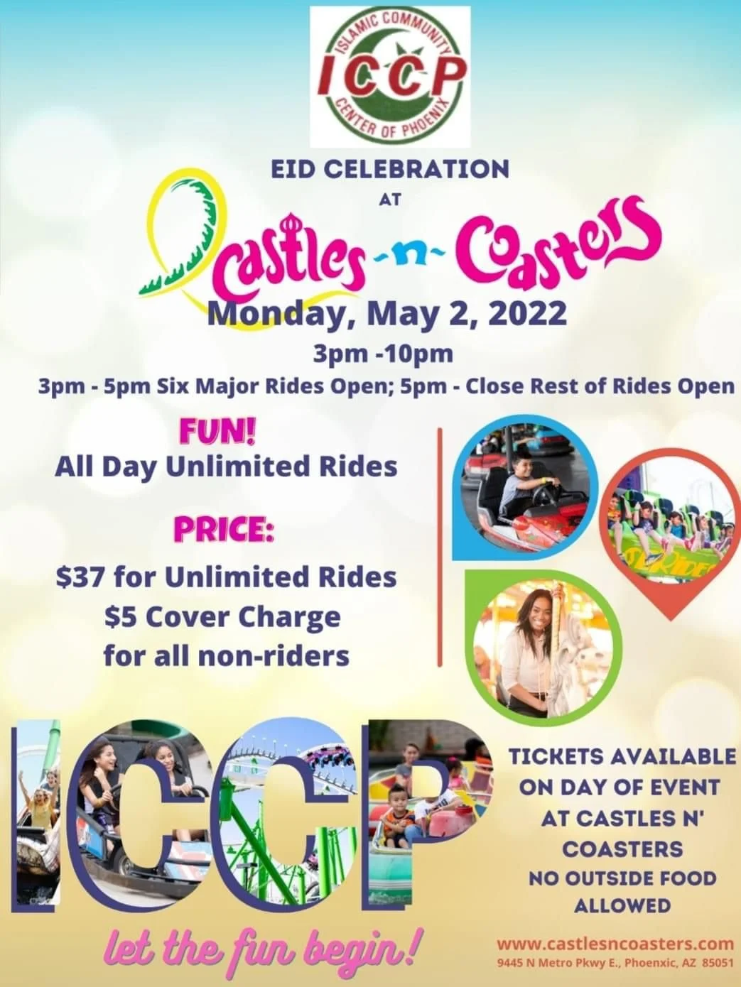 ICCP Eid Celebration View fullsize Monday, May 2, 2022 from 3 PM till 10 PMDirection: Castles N' Coasters 9445 N Metro Pkwy E, Phoenix, AZ 85051 Asma NooruddinApril 30, 2022Comment Facebook0 Twitter LinkedIn0 Reddit Tumblr 0 Likes
