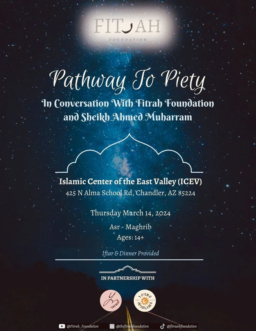 ICEV - Pathway to Piety 2024 View fullsize Thursday, March 14, 2024 from 5:30 PM till 6:30 PMDirection: 425 N Alma School Rd, Chandler, AZ 85224 RSVP: https://forms.gle/zf5cZfro4cBnRqeA7 Asma NooruddinOctober 15, 2023Comment Facebook0 Twitter LinkedIn0 Reddit Tumblr 0 Likes