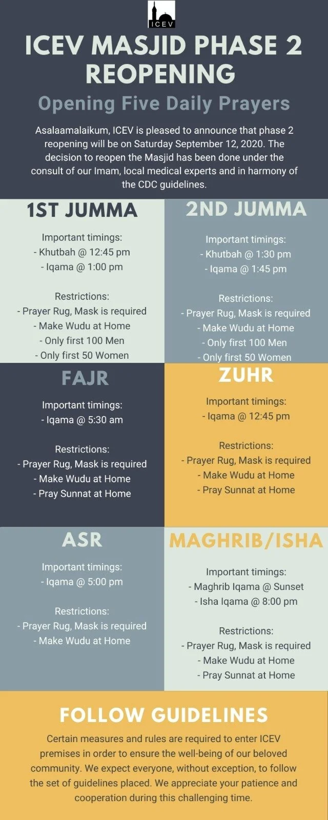 Good morning, الحمد لله رب العالمين ICEV phase II Reopening for brothers & sisters start this weekend for all 5 prayers & 2 Jumuah prayers on Friday, w/ 😷 & SD bring your own سجادة Prayer Rug. No kids though😬 only 15 yrs plus. Please take good care of yourself, be mindful. May Allah سبحانه وتعالى ease the hardships, keep us healthy, bring tranquility & encompass our heart with strong Iman يا رب العالمين 🤲🏾
