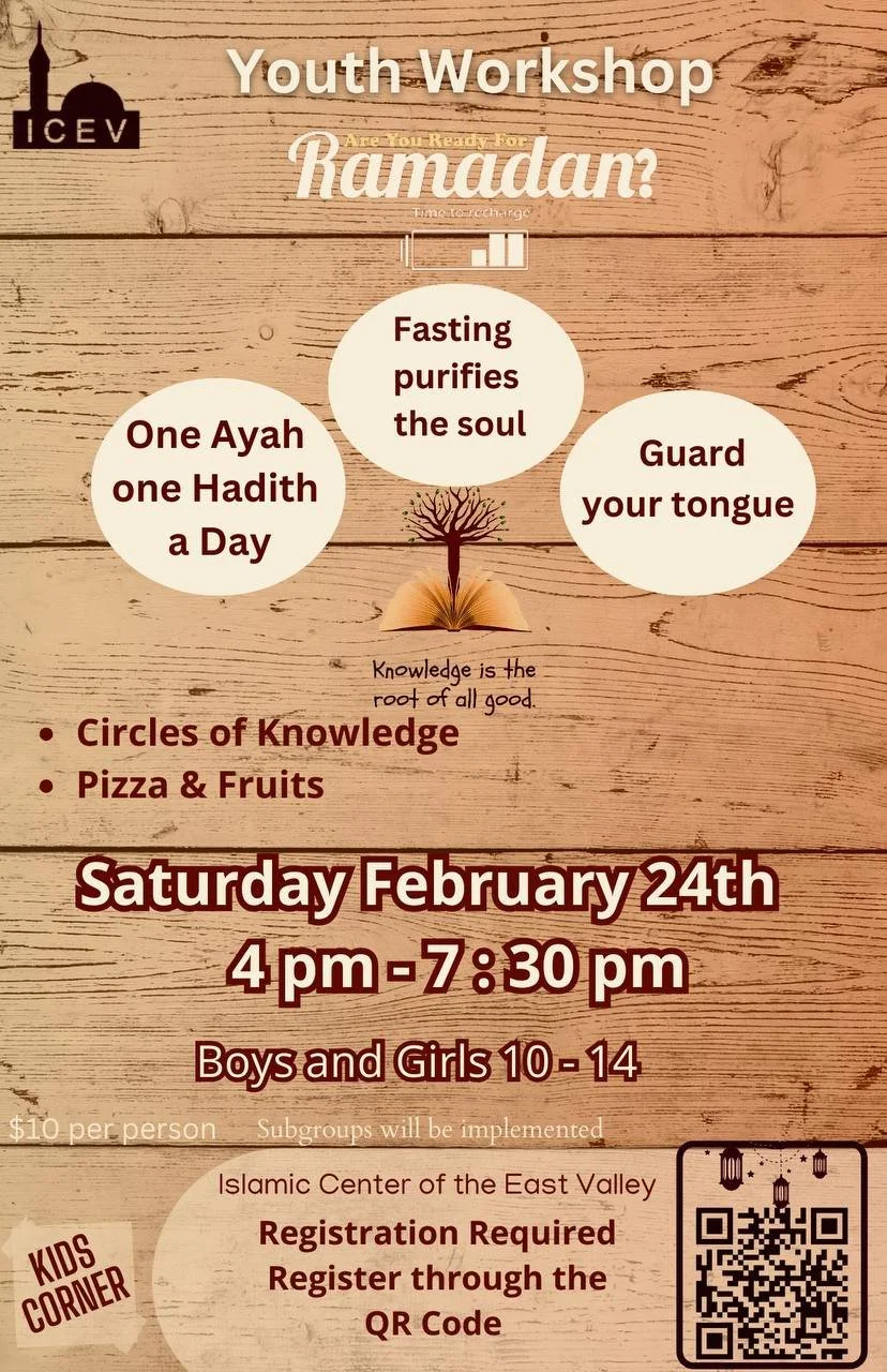 ICEV - Youth Ramadan Workshop 2024 View fullsize Saturday, February 24, 2024 from 4 PM till 7:30 PMDirection: 425 N Alma School Rd, Chandler, AZ 85224 Asma NooruddinOctober 16, 2023Comment Facebook0 Twitter LinkedIn0 Reddit Tumblr 0 Likes