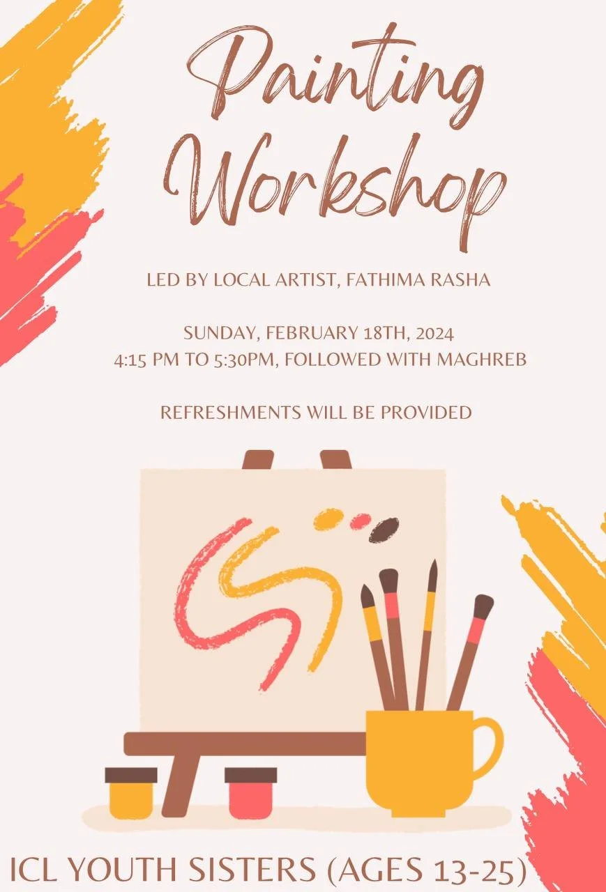 ICL - Painting Workshop 2024 View fullsize Sunday, February 18, 2024 from 4:15 PM till 5:30 PMDirection: 5099 W Dobbins Rd #1, Laveen Village, AZ 85339 Asma NooruddinOctober 16, 2023Comment Facebook0 Twitter LinkedIn0 Reddit Tumblr 0 Likes
