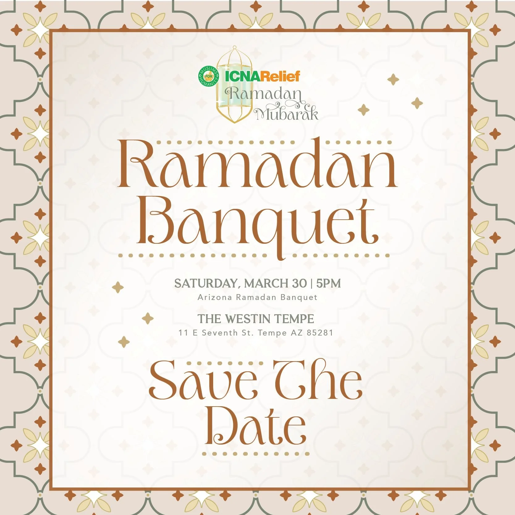 ICNA Relief - Ramadan Banquet 2024 View fullsize Saturday, March 30, 2024 at 5 PMDirection: The Westin Tempe 11 E 7th St, Tempe, AZ 85281RSVP: http://tinyurl.com/RamadanBanquet Asma NooruddinOctober 15, 2023Comment Facebook0 Twitter LinkedIn0 Reddit Tumblr 0 Likes