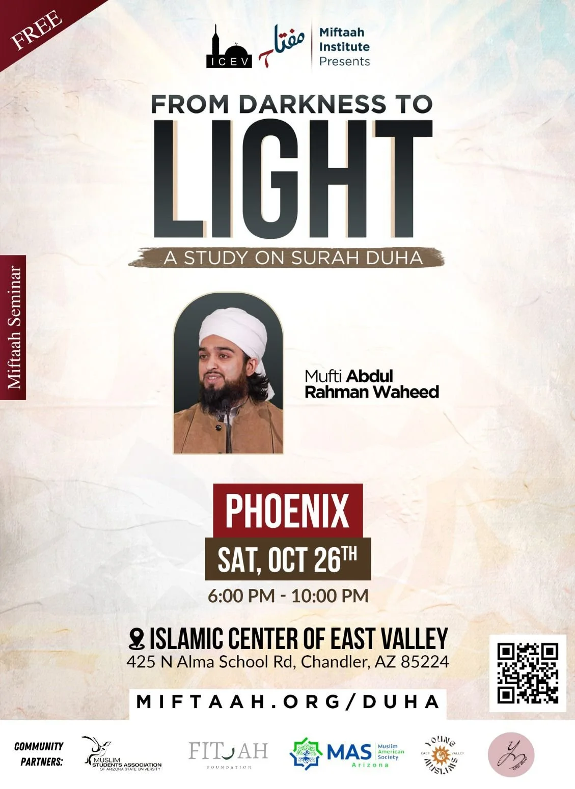 Meftah - From Darkness to Light 2024 View fullsize Saturday, October 26, 2024 from 6 PM till 10 PMDirection: 425 N Alma School Rd, Chandler, AZ 85224 Asma NooruddinSeptember 25, 2023Comment Facebook0 Twitter LinkedIn0 Reddit Tumblr 0 Likes