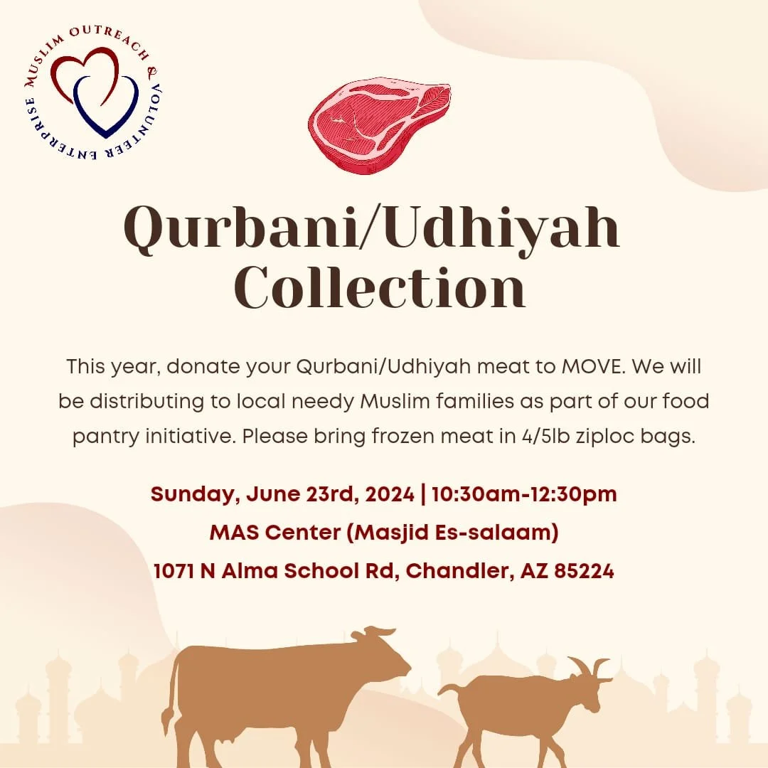 MOVE - Qurbani/Udhiyah Collection 2024 View fullsize Sunday, June 23, 2024 from 10:30 AM till 12:30 PMDirection: 1071 N Alma School Rd, Chandler, AZ 85224 Asma NooruddinSeptember 21, 2023Comment Facebook0 Twitter LinkedIn0 Reddit Tumblr 0 Likes