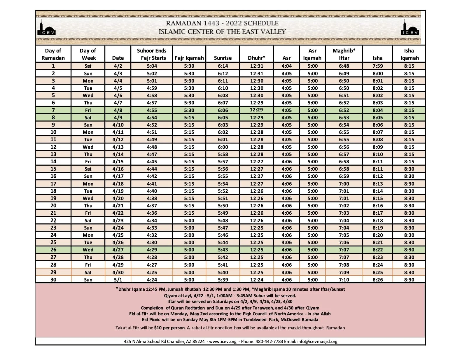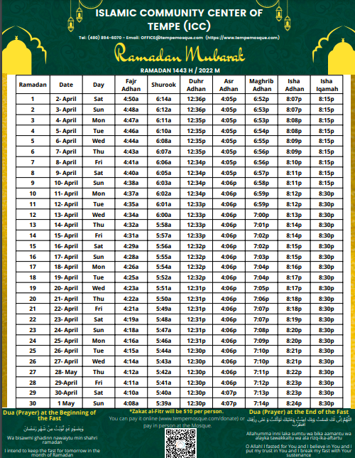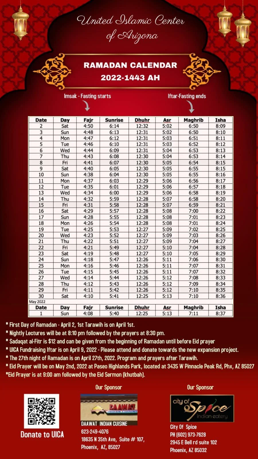 Ramadan Iftar-Suhoor & Taraweeh Schedule 2022
