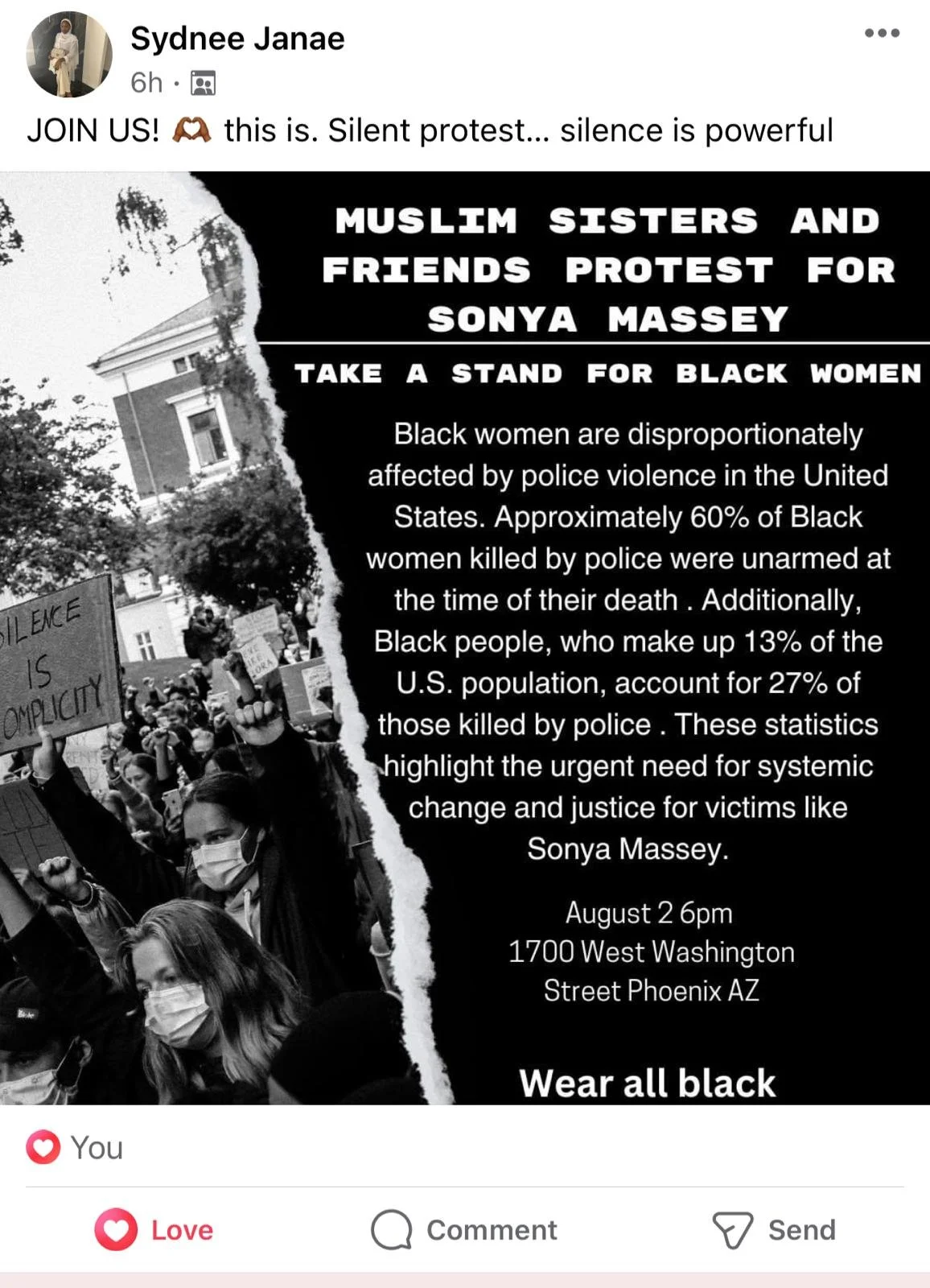 Silent Protest for Sonya Massey 2024 View fullsize Friday, August 2, 2024 at 6 PMDirection: 1700 W Washington St, Phoenix, AZ 85007 View fullsize Asma NooruddinNovember 26, 2023Comment Facebook0 Twitter LinkedIn0 Reddit Tumblr 0 Likes