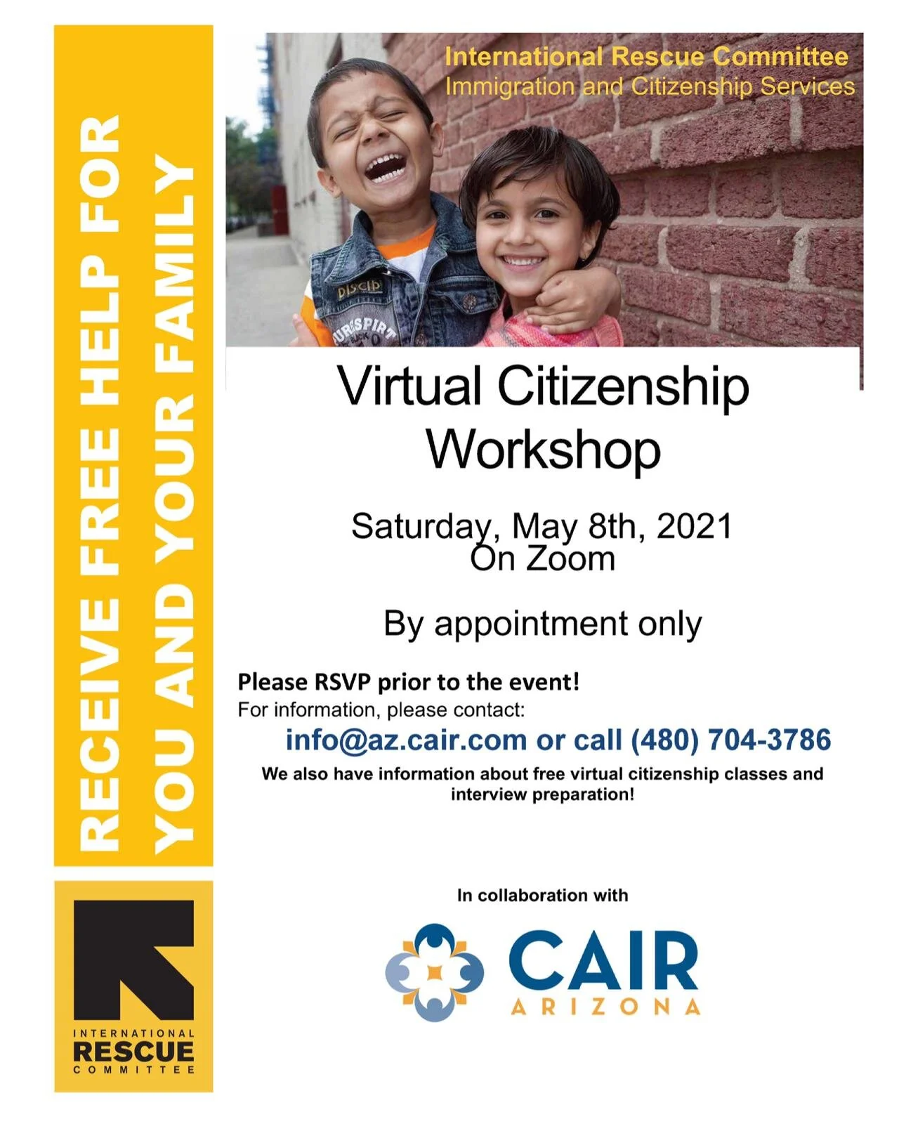 Virtual Citizenship Workshop View fullsize Saturday, May 8, 2021 on ZoomBy appointment onlyinfo@az.cair.com or call +1 (480) 704-3786 Asma NooruddinApril 6, 2021Comment Facebook0 Twitter LinkedIn0 Reddit Tumblr 0 Likes