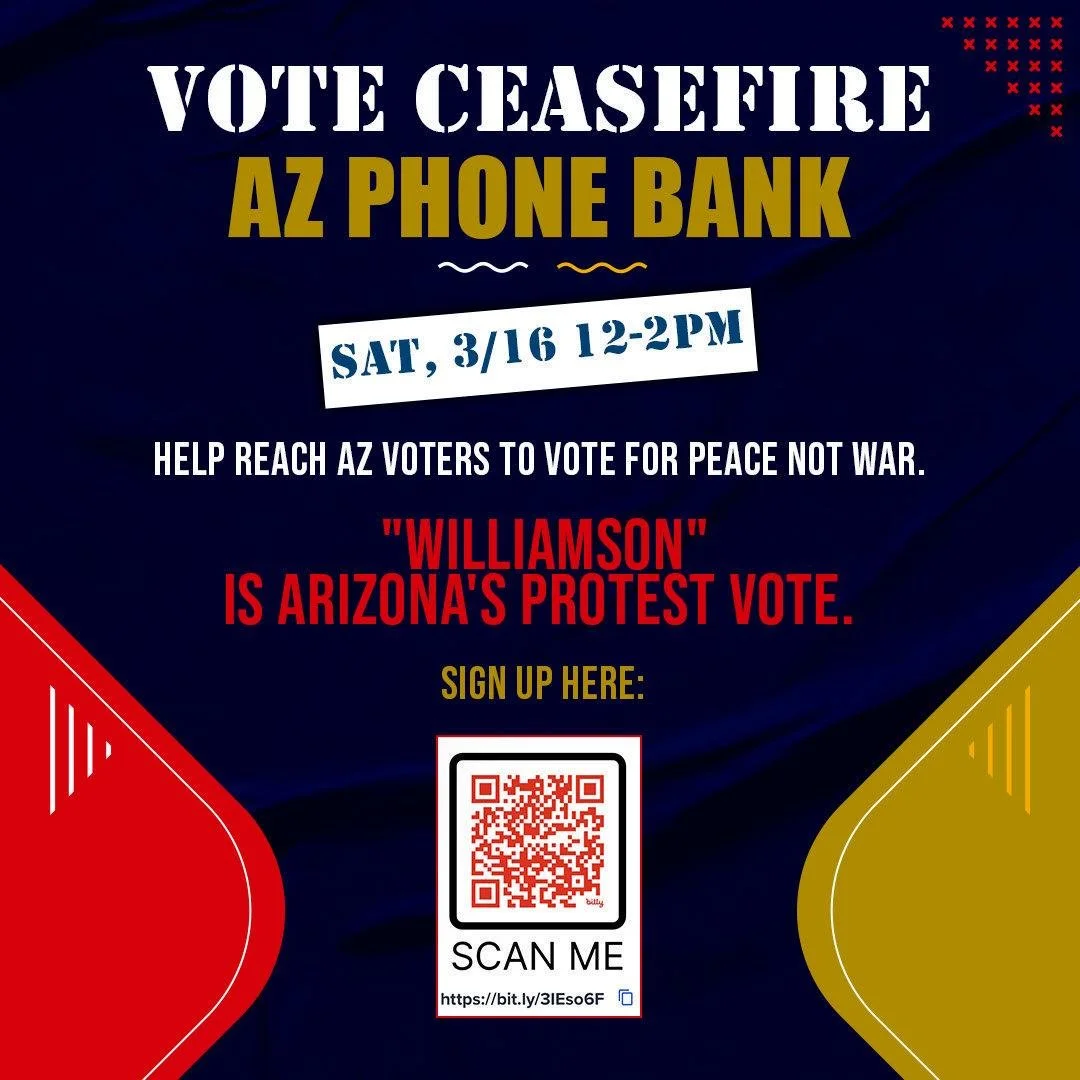 Vote Ceasefire AZ 2024 View fullsize Cast your vote on March 19, 2024Scan to join in.Saturday, March 16, 2024 from 12 PM till 2 PM View fullsize Asma NooruddinJanuary 19, 2024Comment Facebook0 Twitter LinkedIn0 Reddit Tumblr 0 Likes