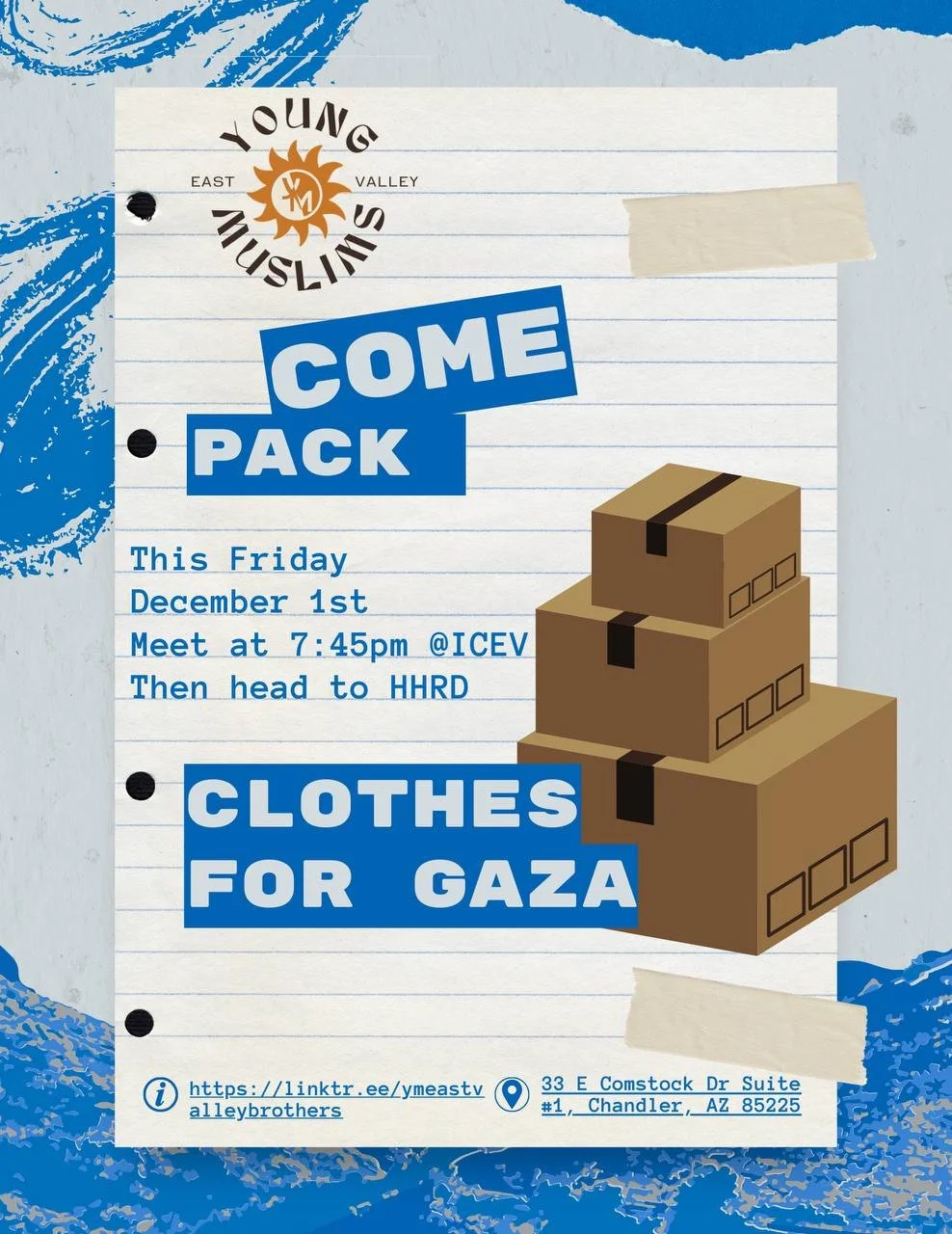 YM - Pack Clothes for Gaza 2023 View fullsize Friday, December 1, 2023 at 7:45 PMDirection: 33 E Comstock Dr Suite #1, Chandler, AZ 85225 Asma NooruddinNovember 1, 2023Comment Facebook0 Twitter LinkedIn0 Reddit Tumblr 0 Likes