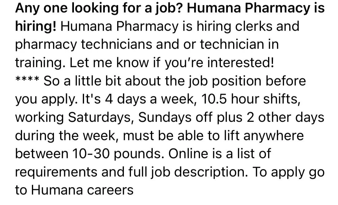 Humana Pharmacy - View fullsize https://www.indeed.com/q-Humana-Pharmacy-jobs.html?vjk=7d22e27e55d5e4bf Use referral name: Natalie Roberson Asma NooruddinJune 12, 2021Comment Facebook0 Twitter LinkedIn0 Reddit Tumblr 0 Likes