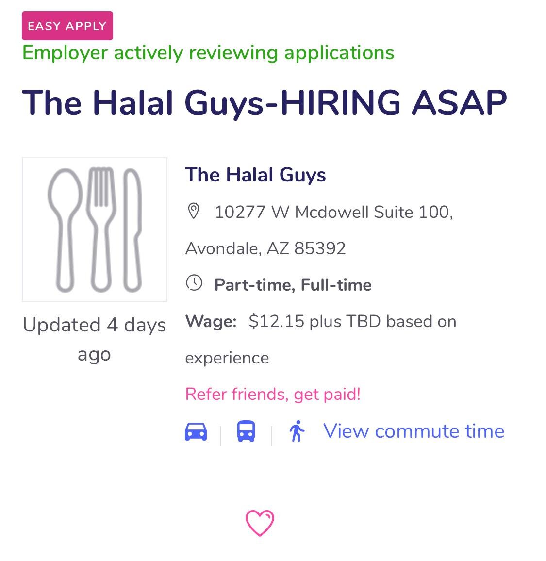 The Halal Guy - Avondale - Part/Full Time View fullsize Wage $12.1510277 W McDowell Rd Avondale, AZ 85392 Asma NooruddinJanuary 26, 2021Comment Facebook0 Twitter LinkedIn0 Reddit Tumblr 0 Likes