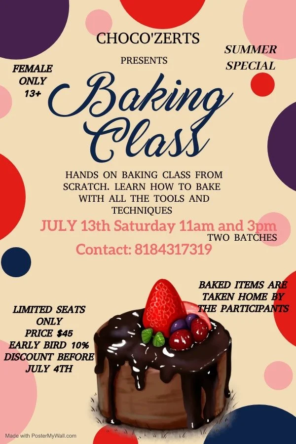 Choco'zerts - Cake Baking Classes 2024 Saturday, July 13, 2024 from 11 AM till 3 PM Contact: +1 (818) 431-7319Amazing opportunity this summer to learn cake baking skills. 10% early bird discount ends on July 4th. Asma NooruddinJune 28, 2024Comment Facebook0 Twitter LinkedIn0 Reddit Tumblr 0 Likes