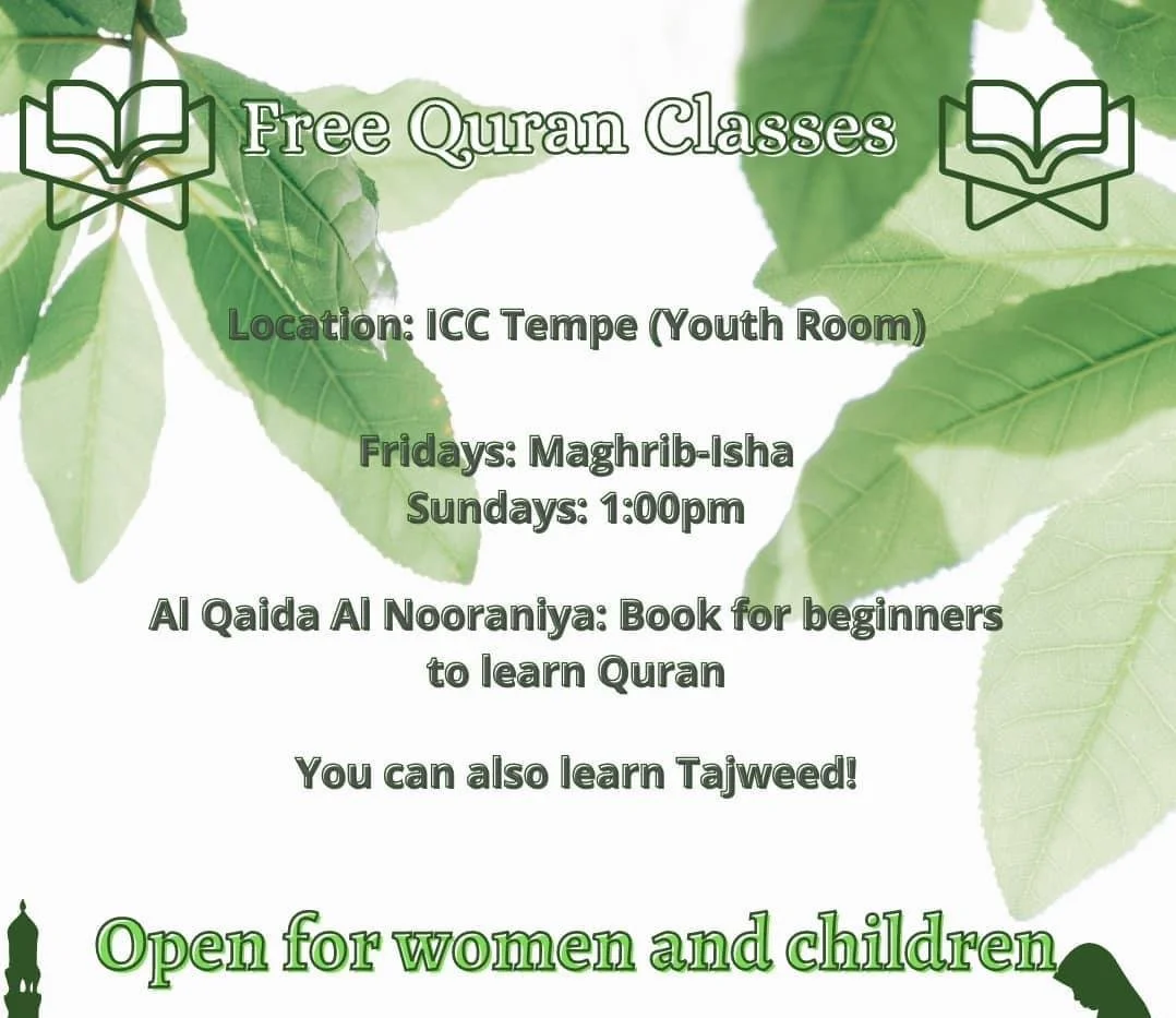 Free Quran Classes View fullsize Fridays, after Maghrib and IshaSundays at 1 PMDirection: ICC Youth Room 131 E 6th St, Tempe, AZ 85281 Asma NooruddinAugust 24, 2022Comment Facebook0 Twitter LinkedIn0 Reddit Tumblr 0 Likes