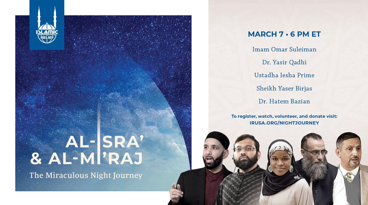 Al-Isra & Al-Mi'raj Sunday, March 7, 2021 4:00 PM 5:00 PM 16:00 17:00 Google Calendar ICS Al-Isra & Al-Mi’raj - The Miraculous Night JourneySunday, March 7, 2021 at 4 PM (Arizona Time) Watch: https://www.youtube.com/watch?v=Za7WoVradQU https://irusa.org/NIGHTJOURNEY/