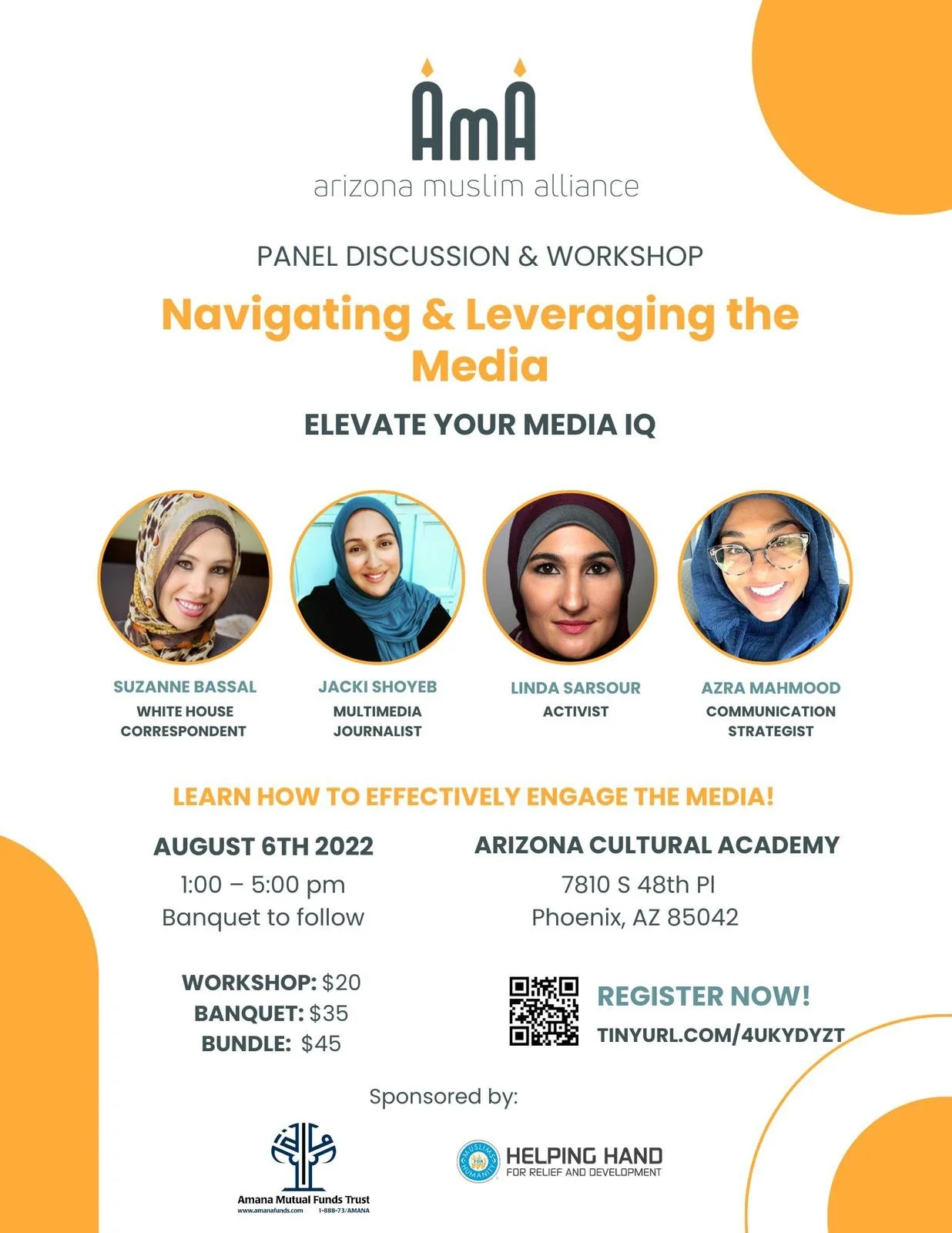 We are excited to host this incredible panel of Media professionals and activists for a workshop on how to navigate the media as a Muslim and/or Muslim organization. This event will be followed by an evening banquet with Linda Sarsour.