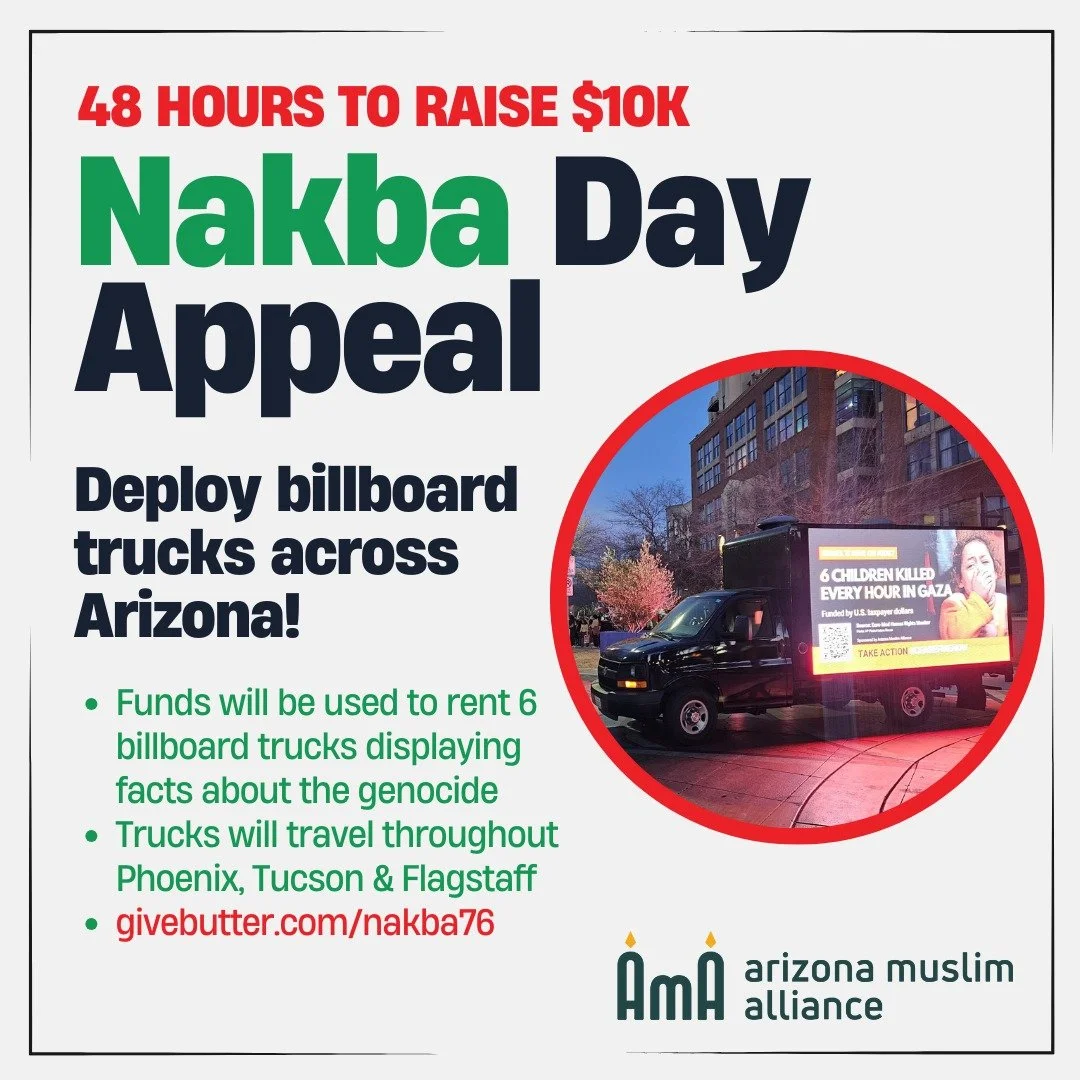 AMA is deploying a fleet of billboard trucks across Arizona to coincide with a major rally on May 18th to commemorate the Nakba or catastrophe that befell the Palestinian people 76 years ago on May 15.