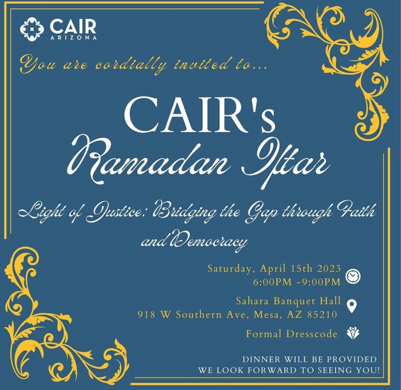 CAIR - Ramadan Iftar 2023 Saturday, April 15, 2023 6:00 PM 9:00 PM 18:00 21:00 Google Calendar ICS View fullsize Saturday, April 15, 2023 from 6 PM till 9 PMDirection: Sahara Banquet Hall 918 W Southern Ave, Mesa, AZ 85210