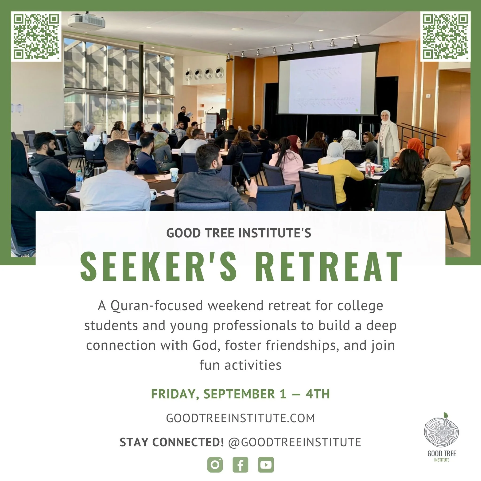 Please encourage friends and family to register for the upcoming retreat for collage and young professionals on Labor Day weekend. It is called Seeker’s Retreat. We are going to be studying Surah Al-Hujurat and it is all about powerful communication and breaking down the invisible walls we have with people and God. https://www.goodtreeinstitute.com/seekersretreat.html