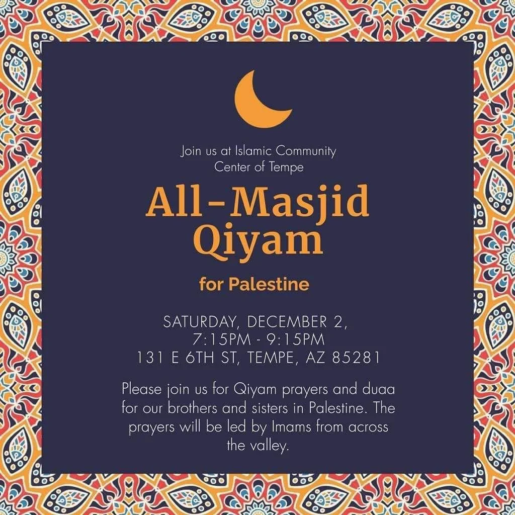 ICC - All Masjid Qiyam 2023 Saturday, December 2, 2023 7:15 PM 19:15 Sunday, December 3, 2023 9:15 AM 09:15 Google Calendar ICS View fullsize Saturday, December 2, 2023 from 7:15 PM till 9:15 PMDirection: 131 E 6th St, Tempe, AZ 85281