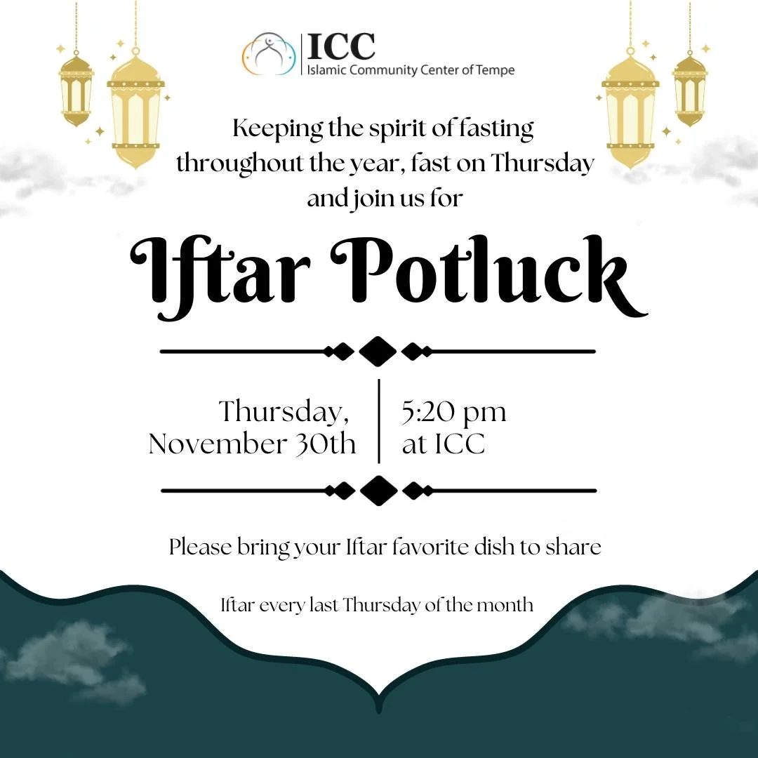 ICC - Iftar Potluck 2023 Thursday, November 30, 2023 5:20 PM 6:30 PM 17:20 18:30 Google Calendar ICS View fullsize Thursday, November 30, 2023 at 5:20 PMDirection: 131 E 6th St, Tempe, AZ 85281