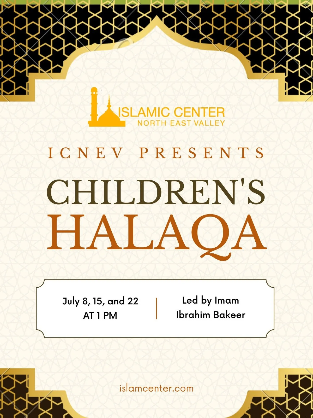 ICNEV - Children's Halaqa 2023 Saturday, July 22, 2023 1:00 PM 2:00 PM 13:00 14:00 Google Calendar ICS View fullsize Saturdays, July 8, 15, 22, 2023 at 1 PMDirection: 12125 E Vía Linda, Scottsdale, AZ 85259