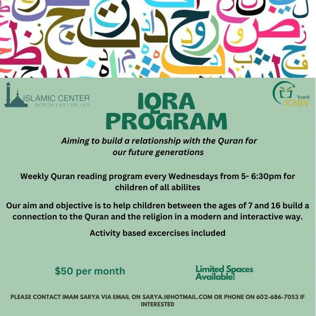 ICNEV - Iqra Program Wednesday, May 24, 2023 5:00 PM 6:30 PM 17:00 18:30 Google Calendar ICS View fullsize Wednesdays from 5 PM till 6:30 PMDirection: 12125 E Vía Linda, Scottsdale, AZ 85259