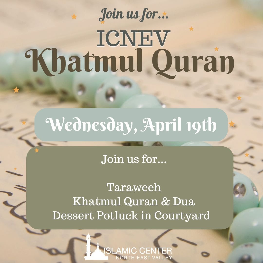 ICNEV - Khatmul Quran 2023 Wednesday, April 19, 2023 8:00 PM 10:00 PM 20:00 22:00 Google Calendar ICS View fullsize Wednesday, April 19, 2023 at 8 PMDirection: 12125 E Vía Linda, Scottsdale, AZ 85259