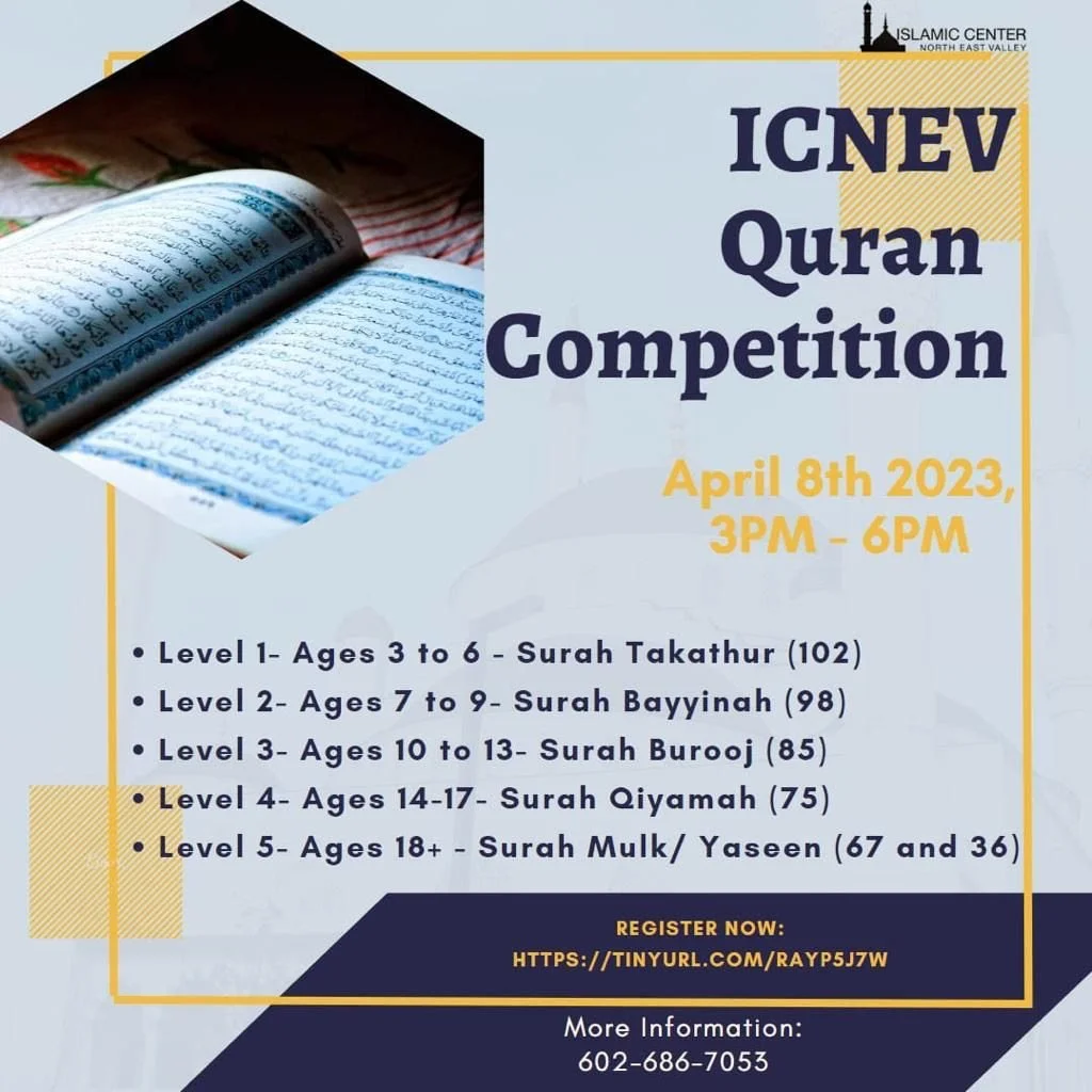 ICNEV - Quran Competition 2023 Saturday, April 8, 2023 3:00 PM 6:00 PM 15:00 18:00 Google Calendar ICS View fullsize Saturday, April 8, 2023 from 3 PM till 6 PMDirection: 12125 E Vía Linda, Scottsdale, AZ 85259
