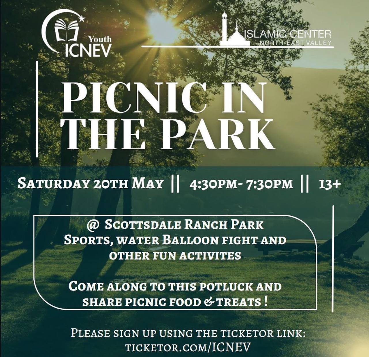 ICNEV Youth - Picnic in the Park 2023 Saturday, May 20, 2023 4:30 PM 7:30 PM 16:30 19:30 Google Calendar ICS View fullsize Saturday, May 20, 2023 from 4:30 PM till 7:30 PMDirection: Scottsdale Ranch Park 10400 E Vía Linda, Scottsdale, AZ 85260