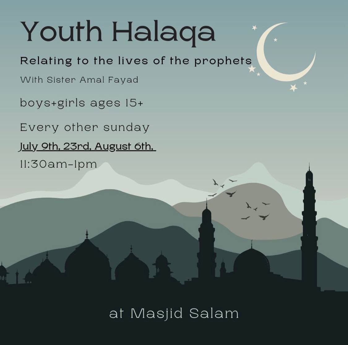 Masjid Salaam - Youth Halaqa 2023 Sunday, August 6, 2023 11:30 AM 1:00 PM 11:30 13:00 Google Calendar ICS View fullsize Sundays, July 9 to August 6, 2023 from 11:30 AM till 1 PMDirection: 1071 N Alma School Rd, Chandler, AZ 85224