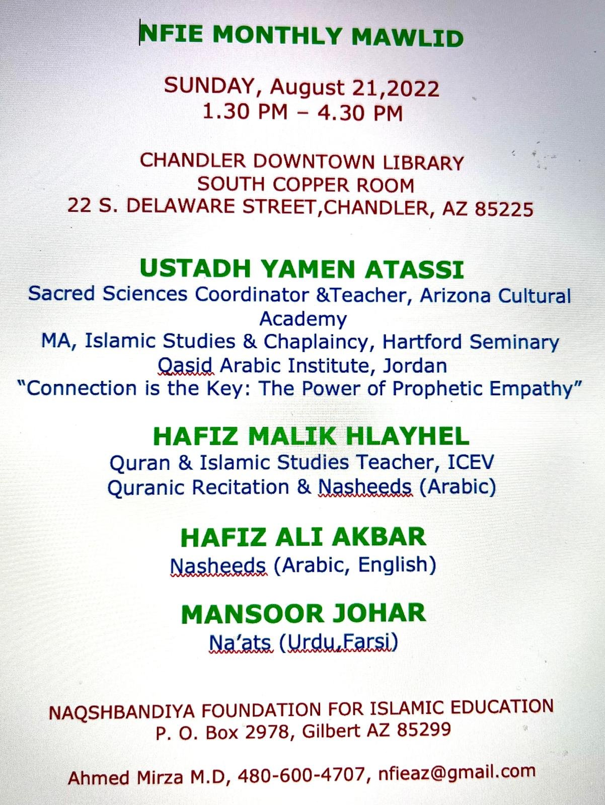 NFIE Monthly Mawlid Sunday, August 21, 2022 1:30 PM 4:30 PM 13:30 16:30 Google Calendar ICS View fullsize Sunday, August 21, 2022 from 1:30 PM till 4:30 PMDirection: Chandler Downtown Library 22 S Delaware St, Chandler, AZ 85225
