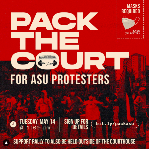 Join us next Tuesday, May 14th at 1:00 PM to pack the court in support of the 70+ protesters that are facing charges for standing in solidarity with the people of Gaza and for demanding ASU end its relationships with the genocidal, apartheid state of Israel.