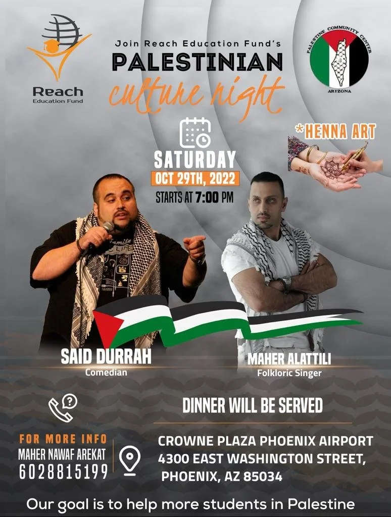 Palestinian Cultural Night Saturday, October 29, 2022 7:00 PM 9:00 PM 19:00 21:00 Google Calendar ICS View fullsize Saturday, October 29, 2022 at 7 PMDirection: Crowne Plaza Phoenix Airport 4300 E Washington St, Phoenix, AZ 85034
