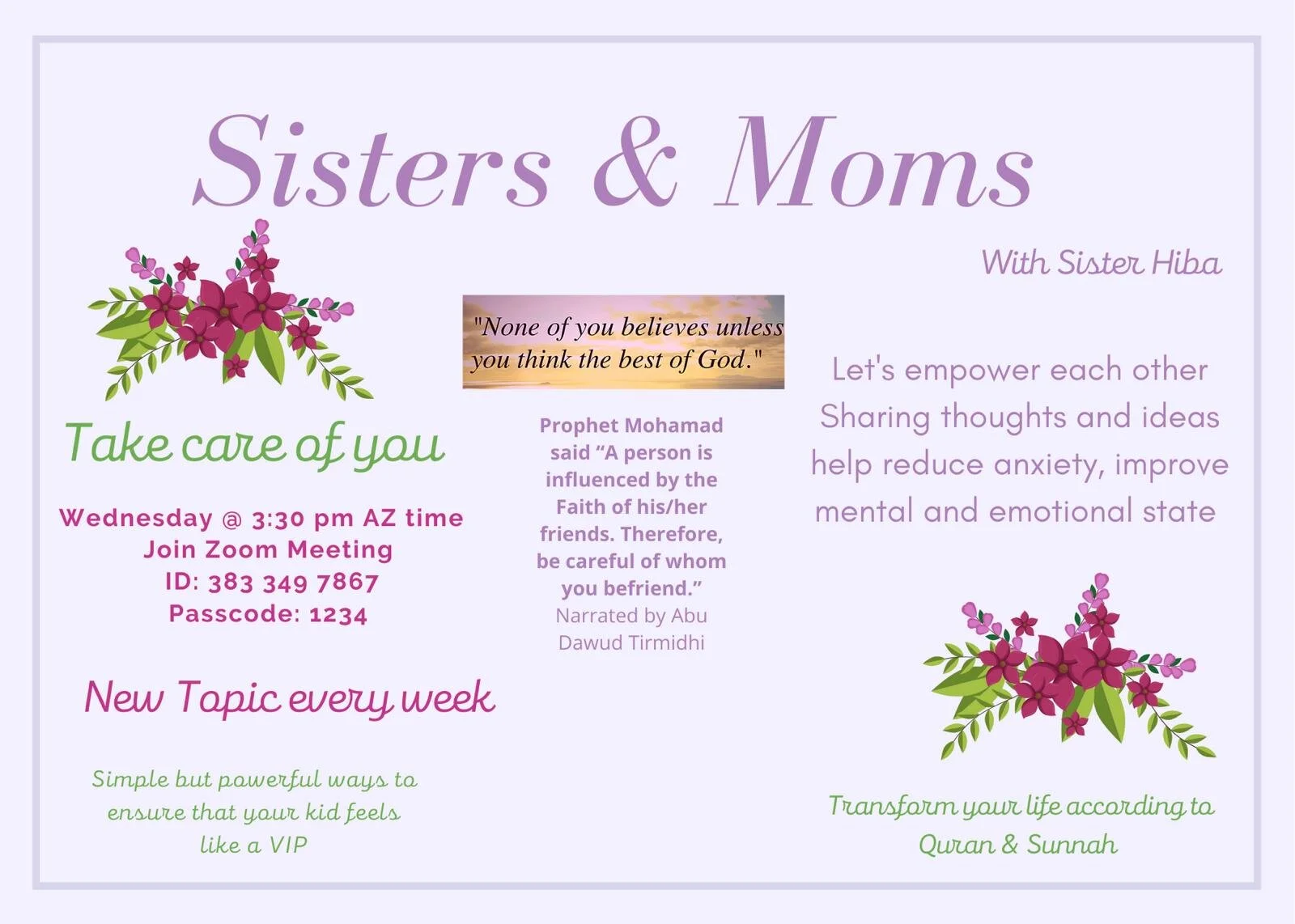 🌸Wednesday @ 3:30 Join https://us02web.zoom.us/j/3833497867?pwd=iaMZQPbQ3QCGLmRDwral4uCd40Q Meeting ID: 383 349 7867 Passcode: 1234