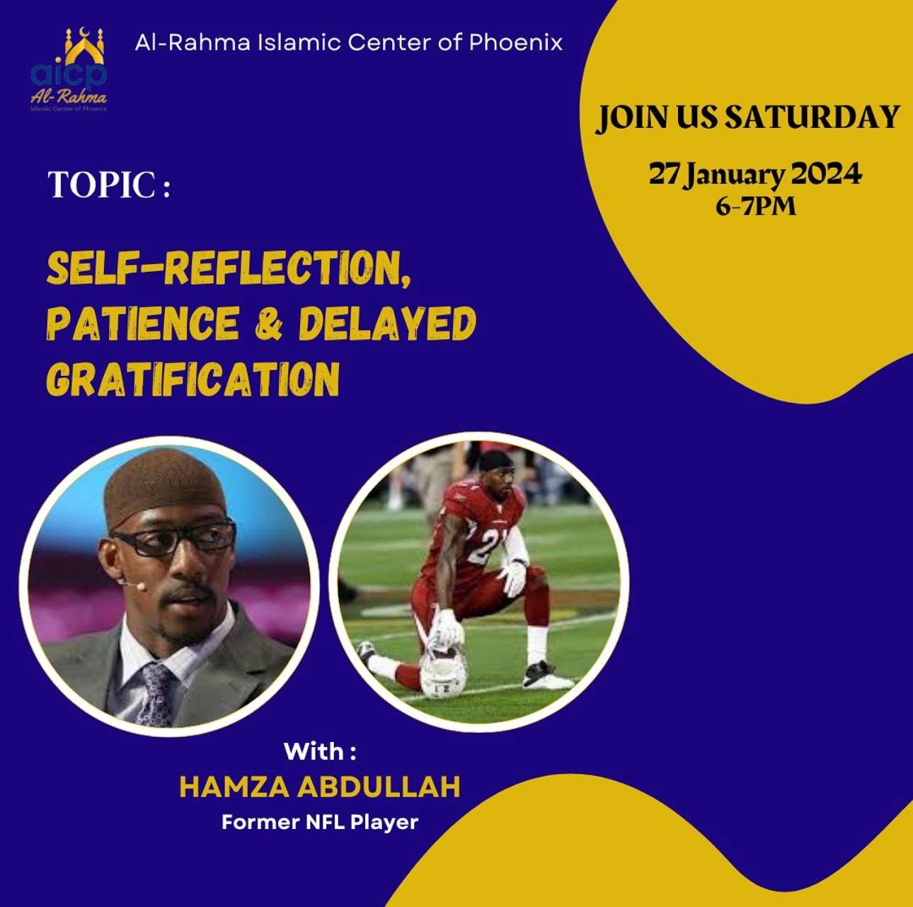 Rahma - Self Reflection, Patience & Delayed Gratification 2024 Saturday, January 27, 2024 6:00 PM 7:00 PM 18:00 19:00 Google Calendar ICS View fullsize Saturday, January 24, 2024 from 6 PM till 7 PMDirection: 2916 E McDowell Rd, Phoenix, AZ 85008