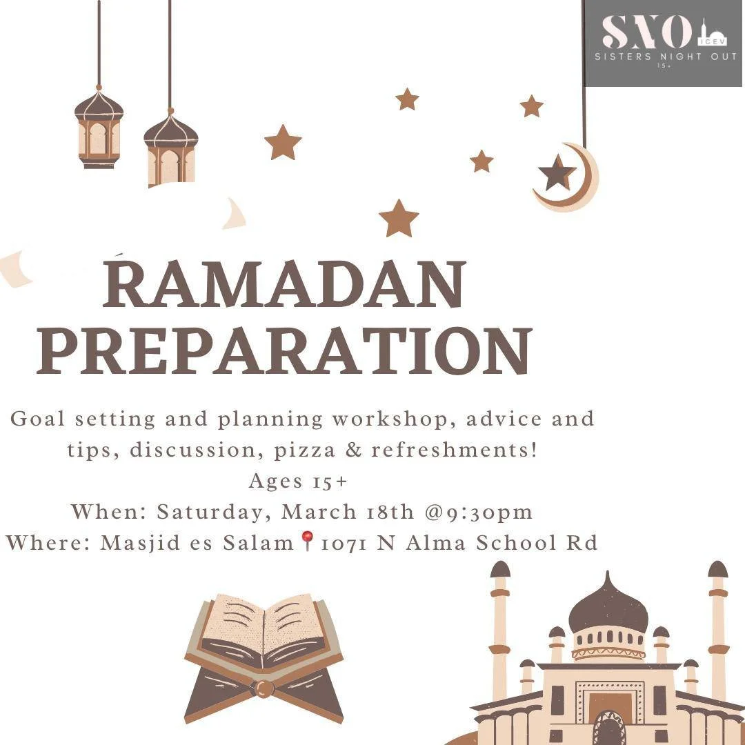 SNO - Ramadan Preparation Saturday, March 18, 2023 9:30 PM 10:30 PM 21:30 22:30 Google Calendar ICS View fullsize Saturday, March 18, 2023 at 9:30 PMDirection: 1071 N Alma School Rd, Chandler, AZ 85224